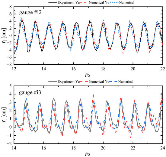 Comparison of the wave elevations in #i2 and #i3 with the experimental results (H = 0.04 m, T = 0.91 s, and draft = 0.1305 m; Yu et al. [30]).