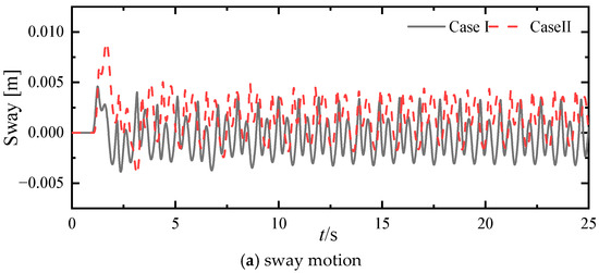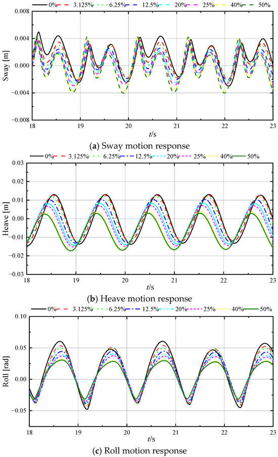 A numerical simulation study was conducted on the perforated tank structure with varying side opening ratios (P). A comparative analysis was first performed on motion response characteristics, specifically roll, sway, and heave, to evaluate the hydrodynamic behavior of the perforated structure under different opening ratios. The three-degree-of-freedom (3-DOF) motion response time history curves of the perforated tank are presented in Figure 12. As shown in Figure 12, the perforations are beneficial for reducing the motion response amplitudes, which is conducive to fish farming.