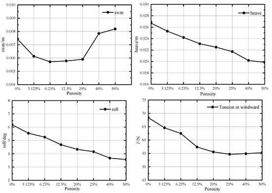 - The influence of the opening ratio on the motion response and mooring line forces was analyzed. The opening ratio was defined as the percentage of the pore area divided by the side area. Different perforation areas had distinct effects on the motion response and mooring line forces.