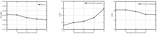 Figure 15 shows the motion responses and mooring line tensions under different schemes. Evidently, the opening area exerted an influence on the heave motion. It is observable that diverse distributions on the perforated vessel had a relatively minor impact on the sway and roll motion responses, while they did have some effect on the heave motion response. As the opening area of the waterplane increased, the amplitude of the heave motion decreased correspondingly. Simultaneously, the viscous dissipation of the fluid passing through the openings augmented the heave damping. The rate of change in the roll value was merely 7.63%, and that of the heave value was only 5.20%. Under the same opening area and opening ratio, the openings at different positions along the water depth direction had little influence on the roll and sway motions.
