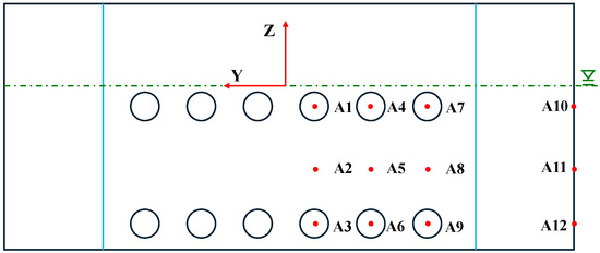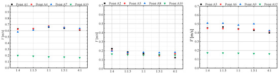 To further clarify the influence of opening positions on the local flow field, a detailed analysis was conducted on the velocity at key points. The velocity points arrangement is shown in Figure 16. A stable time period of the flow field was selected. Figure 17 shows the velocity vector corresponding to various opening designs. Through systematic examination, it was revealed that the local flow fields of different configurations shared common characteristics. This finding was further validated by consistent outcomes from the motion response analysis. Notably, a strong correlation was observed between the flow velocity and the perforation area. As the area of the upper row openings expanded and the area ratio varied from 1:4 to 4:1, the flow velocity at the openings showed a progressive increase.