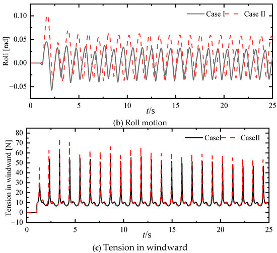 Motion responses and tension of various opening ratios: Case Ⅰ: open ratio 25% in windward, 12.5% in leeward, Case Ⅱ: open ratio 12.5% in windward, 25% in leeward.