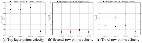 This phenomenon agrees with fluid dynamics principles: under identical flow field conditions, reduced opening areas induce more pronounced flow acceleration. Notably, located at the outer edge, points A10, A11, and A12 demonstrate relatively stable velocity characteristics across both porosity conditions due to their position, showing low sensitivity to opening area variations. Velocity data from four non-perforated measuring points (A2, A5, A8, and A11) in the central region confirm that flow patterns in this area remain independent of porosity changes.