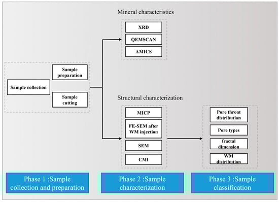 AMICS analysis can identify mineral components and fill WM by scanning the smooth surface of the sample. AMICS analysis was performed using a Zeiss Sigma 300 FE-SEM (Carl Zeiss AG, Oberkochen, Germany), combined with a Bruker Xflash 6/60 energy-dispersive X-ray spectroscopy (Bruker, Berlin, Germany), to quantitatively characterize the components of the sample surface with a resolution of 1 μm. Because the pebbly, coarse-grained sandstone contains grains larger than 2 mm in size, the field-of-view area scanned by the sample is greater than 25 mm2 to represent the overall characteristics of the sample. The associative relationship between the WM filling pores and minerals, as well as the contact relationship between different minerals, can be visualized and quantified using AMICS analysis.