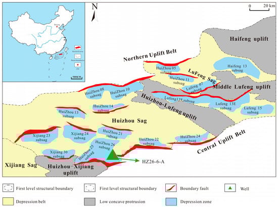 The Huizhou sag of the Pearl River Mouth Basin is located in the eastern region of the South China Sea (Figure 2), encompassing an area of approximately 1.75 × 105 km2. This significant Mesozoic–Cenozoic sedimentary basin was developed on Yanshanian granite and a pre-Cenozoic folded basement []. The basin possesses rich oil and gas resources, rendering it one of the most productive petroliferous basins in the South China Sea. It is categorized from north to south into the Northern Uplift Belt, Northern Depression Belt, Central Uplift Belt, Central Depression Belt, Southern Uplift Belt, and Southern Depression Belt []. The Huizhou Sag is geographically positioned in the central area of the Northern Depression Belt within the Pearl River Mouth Basin. The Paleogene strata within this region, arranged from top to bottom, include the Wenchang Formation, Enping Formation, and Zhuhai Formation. With burial depths exceeding 3000 m, the Paleogene sequences in the Huizhou Sag have experienced extended sedimentation and intricate diagenetic alteration processes. These phenomena have resulted in complex reservoir property evolution, as well as diverse mechanisms and factors influencing the development of effective reservoirs, ultimately leading to significant heterogeneity in reservoir distribution [].