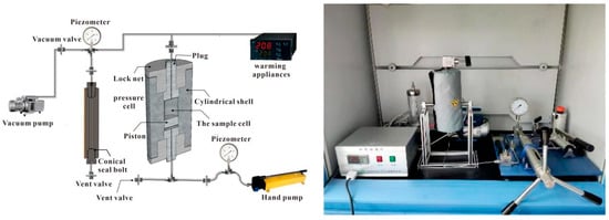 The WM impregnation experiments were performed using a self-developed WM injection apparatus (Figure 5) at the State Key Laboratory of Continental Shale Oil, affiliated with Northeast Petroleum University. The oven-dried cubic sample and WM were placed in the high-pressure sample cell of the WM injection apparatus, which was heated to 110 °C under vacuum conditions to melt the WM (melting point: 80 °C) and wrap the sample. Then, the pressure in the high-pressure sample cell was increased by a hand pump at a rate of 3 MPa/min to 200 MPa and maintained at maximum pressure for one hour to fill the pore space of the sample with the liquid WM. After that, the sample cell was cooled to room temperature while maintaining a pressure of 200 MPa, allowing WM to solidify in the pore space of the sample. Finally, removed from the high-pressure cell after depressurization to ambient conditions and cut in half from the middle to obtain the internal surface of the sample (1 cm2), the WM (40% Bi; 30% Sn; 20% Pb; 10% Cd) used in this study had a surface tension of 420 mN/m in the molten state and a contact angle of 110° on the sample surface. Therefore, according to the Washburn equation, the lower limit of pore throat that can be injected into WM at 200 MPa is approximately 3 nm.