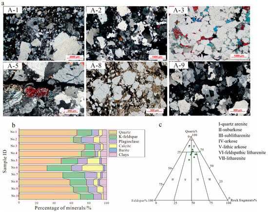 Selected samples of cast thin-section microscopic observations (a); statistics on the content of major minerals, such as quartz and feldspar (b); and sandstone classification triangulation (c).