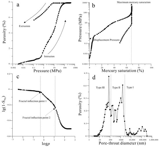 During the MICP experiment, mercury is incrementally intruded into the pore system of the samples by applying increasing pressure, and the corresponding mercury intrusion volume () is recorded at each pressure point. The mercury saturation () at a given pressure is defined as the ratio of the mercury-occupied pore volume to the total pore volume, and it is calculated using the following equation: