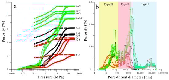 Figure 7a presents the mercury intrusion and extrusion curves for a representative sandstone sample from the ten samples collected from the Huizhou area. The high-pressure mercury intrusion experiment was conducted within a pressure range of 0.0069 MPa to 101 MPa, and the sample exhibited a porosity of 7.91%. The figure also reveals a mercury withdrawal efficiency of 28.22% for this sample.
