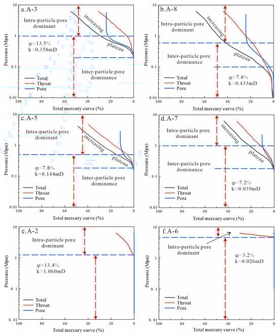 The figure illustrates the Hg intrusion curves from CMI tests of six sandstone samples (including pores, throats, and total pores). The pressure profiles can be categorized into three types based on the intrusion characteristics of Hg in the pores. In the first type of samples, the total intrusion curves show a short “plateau trend” in the low-pressure stage, during which most of the Hg enters into the pores, and only a small portion of the Hg enters into the throats (Figure 9a,b), suggesting that the pore types of this type of sample belong to the category of “large pores and narrow throats”, and the pores are mainly composed of large pores with narrow throats. This indicates that the pore type of these samples belongs to “large pores and narrow throats”, and the pores are mainly dominated by intergranular pores, and in the stage of pressure rise, the mercury only enters into the smaller pores and throats. The second type of samples and the first type of samples have a similar plateau area, but the second type of samples has less pore space, and the mercury mainly enters into the throat during the pressure-rise stage, indicating that the pore type belongs to the “medium pore space and narrow throat”, and the pore space consists of a small portion of intergranular pores and a portion of intragranular pores (Figure 9c,d). In the third type of samples, there is no plateau period, and Hg enters the throat only when the pressure reaches a certain level. The pore type of the third type of samples belongs to the “narrow throat with small pores”, and there is no obvious difference between the pore body and the throat, indicating that the pore related to the intragranular pores is dominant (Figure 9e,f).