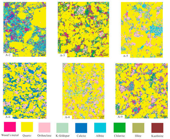 In samples A-5 and A-6, Wood’s metal primarily contacts minerals such as quartz, potassium feldspar, chlorite, and calcite, with permeabilities of 0.144 mD and 0.026 mD, respectively. The proportions of metal are 2.27% and 0.61%, respectively. The low permeability results in poor injectability of the metal, leading to limited accessibility and poor connectivity. Specifically, the A-5 sample mainly develops intragranular pores in illite, albite, and chlorite, while the A-6 sample primarily develops intragranular pores in calcite, albite, and chlorite.