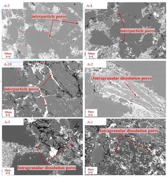 Pore type location and composition were observed by SEM. The planar observations of samples A-3, A-4, and A-10 were mainly intergranular pores. In samples A-2, A-5, and A-1, the planar observation is mainly intragranular pores.