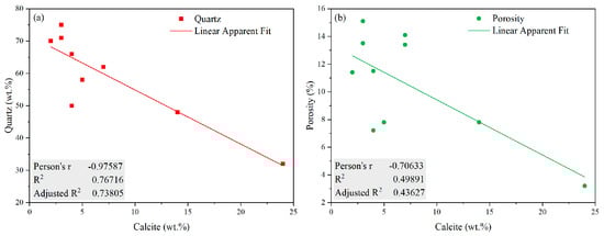 Calcite content vs. quartz content and porosity. There is a negative correlation between calcite and quartz content (a). There is a negative correlation between calcite and porosity (b). Overfilling of calcite reduces porosity.