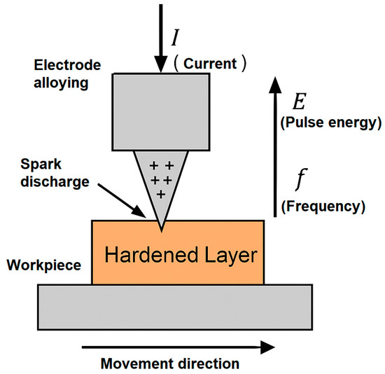 Figure 1 presents a schematic diagram of the electrospark alloying (ESA) process used in this study, illustrating the interaction between the alloying electrode and the workpiece, the formation of spark discharges, and the key process parameters: current (I), pulse energy (E), and pulse frequency (f).