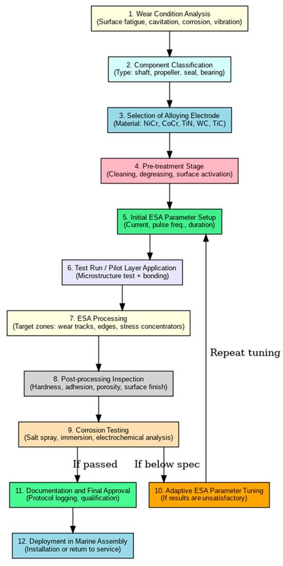 The ESA process flowchart for marine components, presented in Figure 4, outlines the complete life cycle of electrospark alloying, from the initial damage assessment to the final integration of the refurbished part into a marine equipment assembly. The unique challenges of the marine environment, including exposure to saltwater, cavitation, mechanical vibrations, and chemical attack, are integral to the process design.