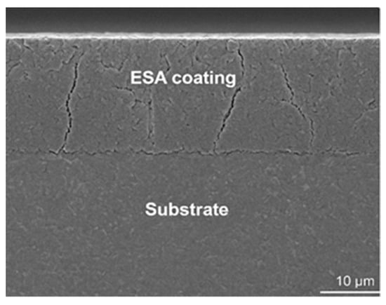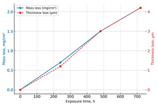 The results of the corrosion resistance tests of the ESA coatings in the salt spray chamber are presented in Figure 5. After 720 h of exposure, the mass loss was only 2.1 mg/cm2, and the coating thickness decreased by approximately 4.2 μm. This test duration corresponds to several years of service in a typical marine environment and provides a re-liable assessment of the coating’s long-term performance. Analysis of the curves indicates stable and uniform corrosion behaviour, with no evidence of localised damage to the layer.