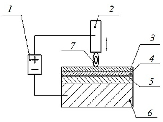 Generalised diagram of the ESA process: 1—pulse generator; 2—alloying electrode (anode); 3—coating layer; 4—modified (hardened) layer; 5—thermal impact zone; 6—part (cathode); 7—spark.