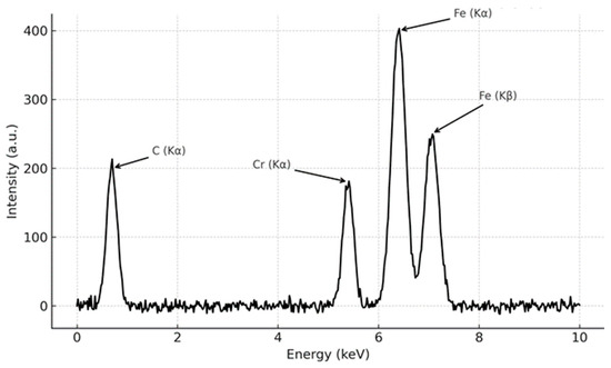 The ESA process parameters used in this study are consistent with literature data, which report the formation of carbide phases confirmed by XRD and EDS analyses under similar conditions. To illustrate a typical phase composition, Figure 7 presents a representative EDS spectrum (adapted from [18,25,53,54]) obtained for marine steel treated by ESA. The spectrum exhibits distinct peaks corresponding to Fe3C and Cr7C3 carbides, as well as elemental carbon, confirming the expected presence of carbide phases in ESA coatings produced under comparable parameters.