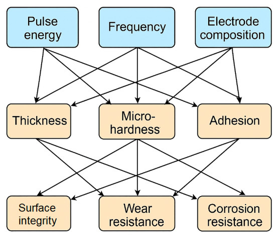 Experimental results indicated that optimal pulse frequency (600–800 Hz) and energy (0.5–1.0 J) increased microhardness by 12–15% and adhesion up to 63 MPa compared with the base material. These findings align with [55], which reported a 10–14% increase in hardness for similar alloys under comparable ESA conditions.