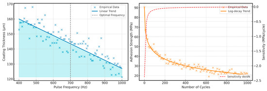 On the other hand, the coating’s adhesion strength gradually decreases logarithmically with the number of loading cycles, indicating the accumulation of fatigue damage in the joint area. Nevertheless, even after 1000 cycles, ESA coatings demonstrate a residual adhesion strength of more than 70 MPa, confirming their durability and functional stability in harsh marine environments. These findings emphasise the feasibility of using ESA as an effective technology for repairing and strengthening critical parts of marine equipment.
