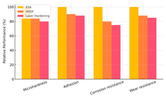 Comparative performance of ESA, HVOF, and laser hardening in terms of microhardness, adhesion, corrosion resistance, and wear resistance (relative percentages).