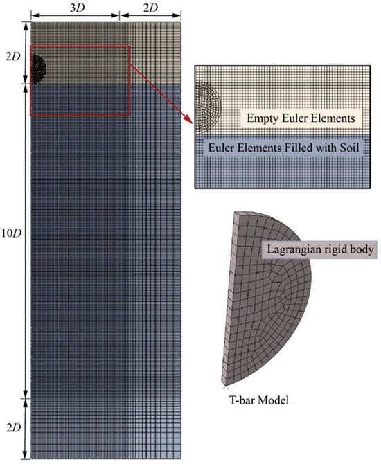 This study involved only one half of the T-bar and soil domain for all analyses, accounting for the symmetry of the characteristic of the model, as illustrated in Figure 1. The T-bar was modeled as a Lagrangian rigid body, while the soil was discretized using Eulerian elements of type EC3D8R. To minimize boundary effects, the Eulerian domain was extended to 5D laterally and 20D vertically, where D denotes the diameter of the T-bar. The Eulerian mesh encompassed the original soil domain and an overlying void layer with a thickness of 2D, facilitating soil flow into the empty Eulerian elements. A uniform mesh, spanning 16D in depth and 3D horizontally, was refined to D/20. Validation in [16] confirmed that mesh sizes smaller than D/20 yield negligible effects on simulation results. The remaining domains were meshed progressively coarser, with the maximum element size near the boundary being approximately D/4.