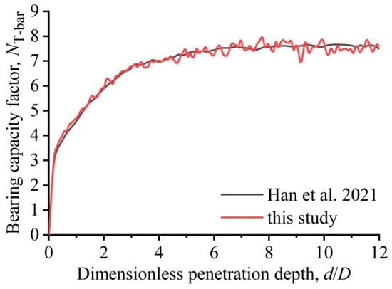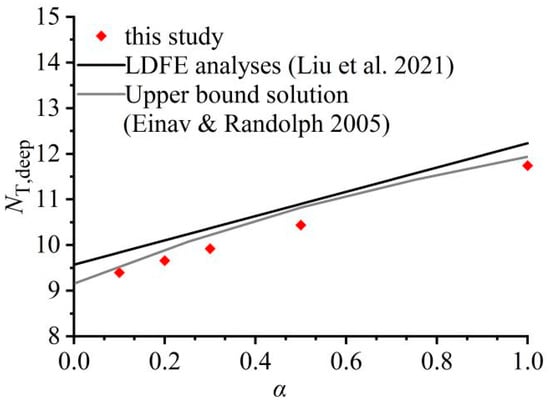 LDFE analyses were conducted using the established model in this study to determine the deep bearing factors without considering strain softening. The computed results under different interface roughness coefficients were compared with the upper-bound solutions [1] as well as the LDFE results from the author work [12]. As shown in Figure 3, the NT,deep values obtained in this study, although slightly lower than those from the upper-bound solutions [1] and numerical calculations [12], exhibit a maximum discrepancy of only 3.5%, which validates the numerical model in this study. The minor discrepancies might be attributed to the following: (1) the interface friction between T-bar and clay in this model was implemented through predefined maximum shear stress, whereas the thin element approach was employed for modeling in [12]; (2) the current simulations modeled the continuous penetration process from shallow to deep depths below the mudline, whereas a pre-embedded T-bar in deep soil layers was assumed in [1,12].