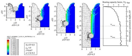 To elucidate the evolution of soil failure mechanisms during the entire process of T-bar penetration from the mudline into the deeper soil strata, this section presents the soil flow modes and associated cumulative plastic strain distributions at various characteristic penetration depths under the given condition (λ = 0.667, St = 5, ξ95 = 15, and su0/γ′D = 4.8). As shown in Figure 4, when the dimensionless penetration depth d/D = 1, the soil surface heaves to accommodate the T-bar, with the surrounding soil predominantly migrating towards the mudline. An open cavity forms above the T-bar. As the T-bar continues to penetrate, the soil at the crown of the T-bar undergoes backward flow accompanied by progressive collapse, leading to gradual narrowing of the lower portion of the open cavity. By the time d/D = 4, the walls of the open cavity close at a certain depth, thereby forming a trapped cavity above the penetrometer. This critical penetration depth where the trapped cavity is formed is therefore defined as the trapped cavity depth wcavity (= dcavity/D). With further increase in penetration depth, the trapped cavity above the penetrometer gradually contracts until it completely heals at d/D = 6.5, resulting in the formation of a localized full-flow mechanism around the T-bar. This critical depth is consequently designated as the full-flow depth wdeep (=ddeep/D). Beyond the critical depth wdeep, the bearing factor is maintained as constant with continued penetration.
