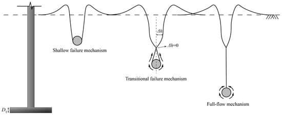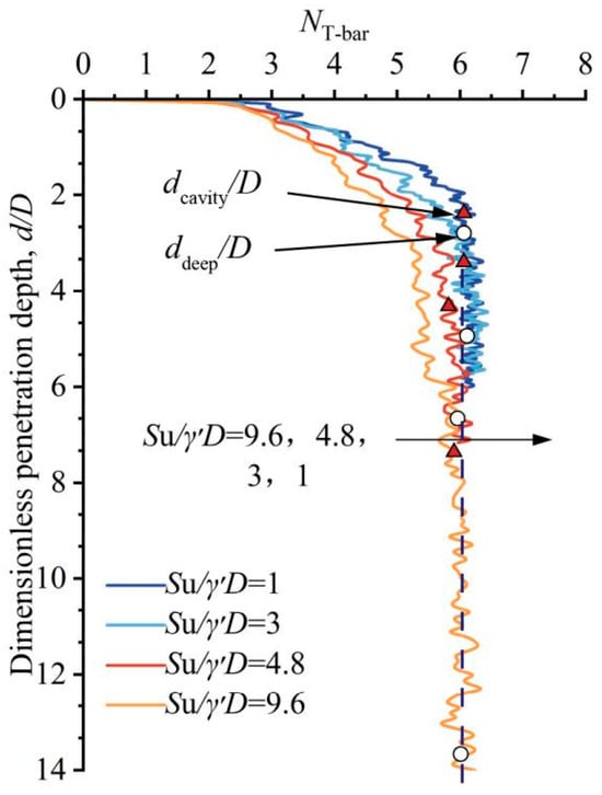 Within the investigated parameter range in this study, the T-bar penetration process consistently exhibits the evolution of failure mechanisms as described above. As shown in Figure 5, when d/D < wcavity, the penetrometer operates under a shallow failure mechanism, characterized by the formation of an open cavity above the T-bar. During the transitional failure phase (also known as the trapped cavity mechanism) at wcavity < d/D < wdeep, two distinct cavity configurations are observed: a trapped cavity at the penetrometer’s crown and an open cavity left in the shallow soil layer. When d/D is beyond wdeep, the trapped cavity is completely closed, whereas the residual open cavity in the shallow soil persists. It is noteworthy that the residual cavity remains stable with continued penetration and has no discernible effect on the bearing resistance profile of the T-bar.
