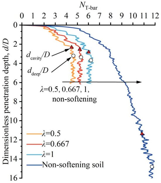 An equation to predict the full-flow penetration depth ddeep/D of T-bar penetrometers was proposed in [16], yet this equation did not account for the influence of ductility parameter ξ95. The effects of su0/γ′D, ξ95, and St on the variation of the bearing factor and critical depths were examined in [13]. However, these studies were based on the conventional strain-softening model, which does not consider the influence of the slope parameter λ. To investigate the effect of λ on the initial penetration characteristics of T-bar, LDFE analyses were performed under conditions of λ = 0.5, 0.667, 0.8, and 1.0. Figure 8 presents the bearing factor profiles across varying λ values (excluding λ = 0.8 for clarity), alongside the non-softening baseline case. As shown in Figure 8, both the bearing factor and the critical penetration depth increase with the slope parameter λ. For instance, when λ increases from 0.5 to 1, the deep bearing factor of the T-bar increases by approximately 10%, while the critical depths dcavity/D and ddeep/D increase by about 13% and 17%, respectively.