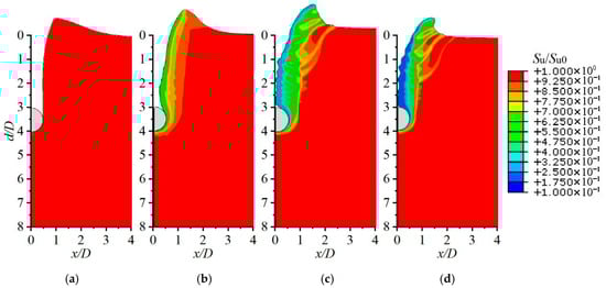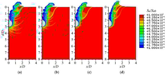 To clarify the influence of soil sensitivity St on T-bar penetration mechanisms, the distributions of accumulated plastic strain and undrained shear strength at a penetration depth of 4D are illustrated in Figure 11 and Figure 12, respectively. A comparison of the accumulated plastic strain distributions in Figure 11 shows that in highly sensitive soils, the plastic strain distribution region is more extensive, and the flow deformation characteristics are more pronounced, which obviously leads to considerable differences in critical penetration depths under varying sensitivity levels.