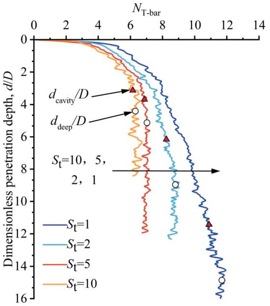 Figure 10 presents the relationship between the bearing factor and penetration depth under different sensitivities. It can be seen that as soil sensitivity increases, the deep bearing factor decreases significantly. Concurrently, both the critical penetration depth values, namely dcavity/D and ddeep/D, diminish with increasing soil sensitivity. For instance, when sensitivity St rises from 2 to 10, ddeep/D decreases from 9.0 to 4.3, while dcavity/D reduces from 6.2 to 3.3.
