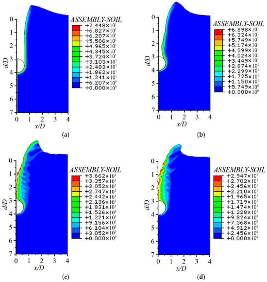 Accumulated plastic strain distributions under the same penetration depth d/D = 4 with different sensitivities. (a) St = 1; (b) St = 2; (c) St = 5; (d) St = 10.
