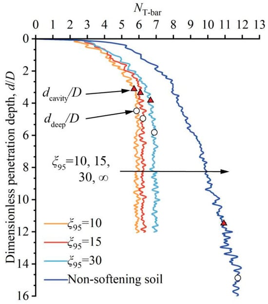 To investigate the influence of the ductility parameter ξ95 on the T-bar bearing factor, cases with ξ95 = 10, 15, 20, and 30 were analyzed. Figure 13 presents the variation of the bearing factor with penetration depth for different ξ95 values. Results for ξ95 = 20 are omitted from Figure 13 for clarity. Figure 13 shows that higher values of the ductility parameter ξ95 correspond to a consequent increase in the bearing factor. For instance, when ξ95 increases from 10 to 30, the deep bearing factor at full-flow conditions increases by approximately 16.6%. Furthermore, both the cavity depth dcavity/D and the full-flow depth ddeep/D increase with higher ξ95 values. This indicates that the ductility parameter ξ95 also exerts a discernible influence on the penetration mechanisms of the T-bar in soil.