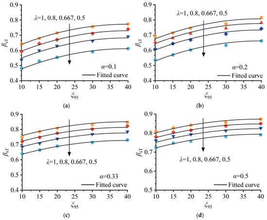 By substituting Equation (12) into Equation (10), the relationship of the softening correction factor βsT with respect to δrem, λ, and the ductility parameter ξ95 can be obtained, as given in Equation (13).