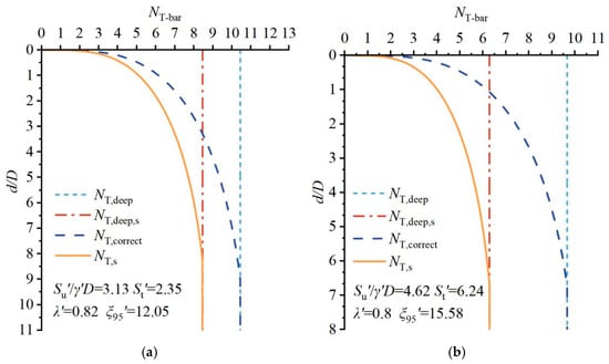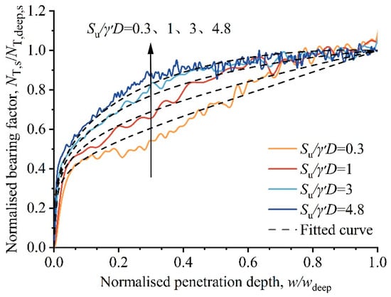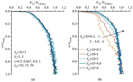 It is seen from Figure 17a that when su/γ′D remains constant, the NT,shallow/NT,deep,s∼w/wdeep curves essentially coincide under different strain-softening parameters. The normalized bearing factor progressively increases to unity with normalized penetration depth w/wdeep. In contrast, Figure 17b demonstrates that the normalized bearing factor NT,shallow/NT,deep,s is associated with the dimensionless strength su/γ′D and the normalized depth w/wdeep, which can be expressed by Equation (14).