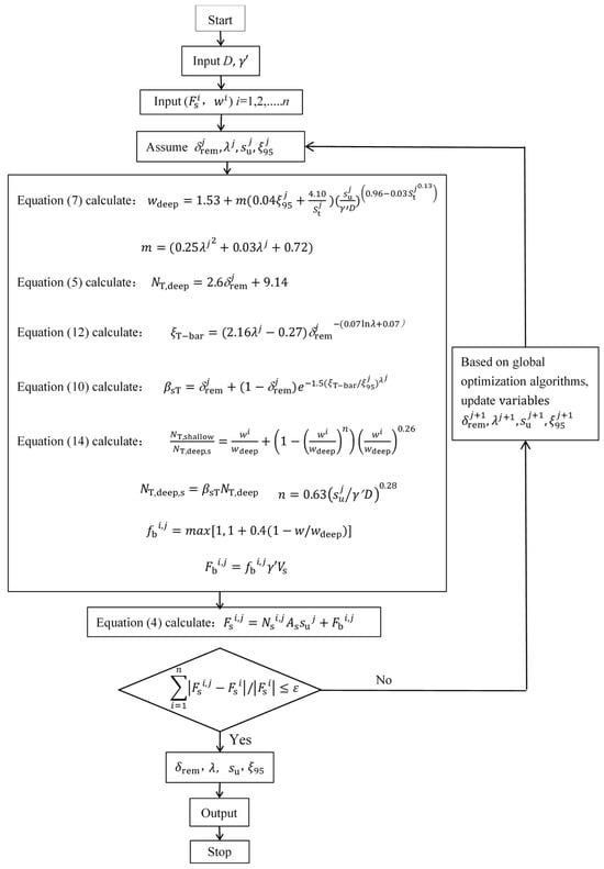 Based on the back-analysis framework [13], the intact undrained strength and strain- softening parameters can be determined using the proposed formulations from preceding sections. The framework operates through an iterative procedure: Initial soil parameters (i.e., su0, ξ95, St, and λ) are assumed, and the T-bar penetration resistance profile versus depth is calculated using these formulations. If the deviation between the calculated profile and the experimental/field-measured curve exceeds a user-defined tolerance threshold, soil parameters are updated via a global optimization process using a genetic algorithm. This iterative scheme continues until convergence is achieved, at which point the optimized parameters represent the actual soil properties. The workflow of this back-analysis procedure is schematically depicted in Figure 19.