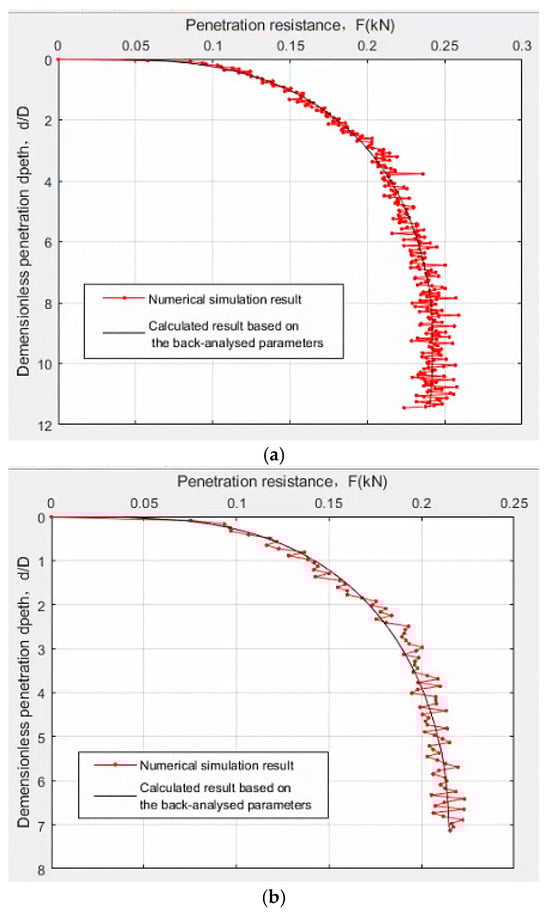 In this section, two sets of numerical tests conducted in this study are employed to verify the reliability of the back-analysis procedure. Following the framework of the back analysis procedure outlined in Figure 19, the Fs ~ d/D curve obtained from the numerical tests is discretized and input into the back analysis program. Subsequently, the optimal soil parameters are identified using a global optimization algorithm. The back-analyzed soil parameters (i.e., su0, ξ95, St, and λ) are compared with those initially input into the numerical tests, as summarized in Table 3. In Table 3, the bracketed values correspond to the original input parameters specified in the numerical test cases. The comparison reveals reasonable agreement between the back-analyzed strength parameters and the input values used in the numerical analyses, which validates the reliability of the proposed back analysis framework.