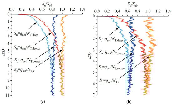 Estimated undrained shear strength versus dimensionless penetration depth. (a) Case 1; (b) case 2.