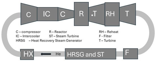 Helium nuclear cycles have traditionally been coupled with Brayton cycles incorporating intercooling, recuperation, and reheating. In order to improve power generation performance, two thermodynamic cycles were analyzed and compared based on thermal efficiency and specific work output. The Brayton cycle, being an intercooled, recuperated, and reheated Brayton cycle (working fluid: helium), was compared to a combined cycle configuration (Figure 1) [] featuring a reheated topping Brayton cycle and a Rankine bottoming cycle with a heat recovery steam generator (working fluids: helium and steam), considering that CCGT configurations can achieve higher thermal efficiencies than most standalone Rankine or Brayton cycles.