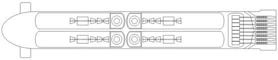 After the internal hull design, reactor sizing, shield thickness, and optimum geometrical ratios were calculated, they were integrated into the submersible vessel. The overall design of the vessel focused on space availability, maximum electrical power output installation, expected costs, and safety needed. Considering all these factors, the design configuration shown in Figure 2 was proposed [].
