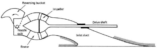 The impeller was driven by an engine at constant shaft rotational speed, and in contrast to propellers, the thrust was modulated by redirecting part of the flow with the aid of a reversing bucket, allowing the driving engine to operate in the best efficiency design point.