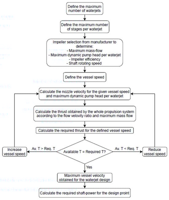 Once the intake-to-nozzle velocity ratio was defined, available thrust (thrust produced by the system) and required thrust calculations for the selected vessel speed were carried out. If available thrust exceeds the required thrust, then the propulsion system would achieve speeds above the selected cruise velocity. Conversely, if required thrust exceeds the available thrust, then the vessel’s maximum speed for the chosen design and assumptions would fall below the target cruise velocity (as shown in the flow chart of Figure 4). The methodology employed an iterative process, and the results shown below correspond to the converged solution (maximum achievable velocity, ).