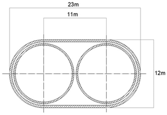 Without having the submersible power plant dimensions defined yet, Typhoon-class submarine external vessel dimensions were taken as reference. The area of reference Aref was defined as the cross-sectional area of the vessel with the maximum value. The cross-section dimensions shown in Figure 5 were determined to contain a double internal pressure hull design and leave some space for the ballast tanks.