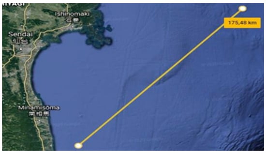 Once the distance between the normal operation location and the earthquake epicenter (Figure 6) was defined (175 km), available reaction time to reach the safety zone was calculated using the tsunami spread speed.