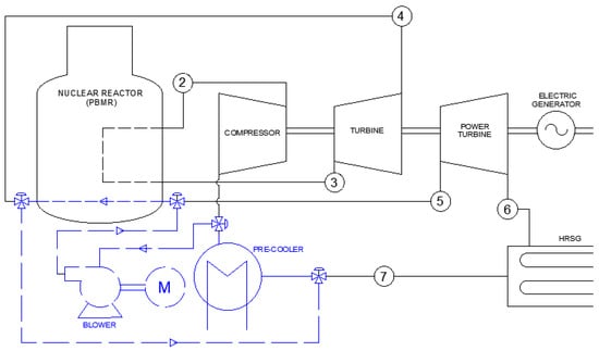 Several solutions could be implemented for reactor cooling in case of insufficient mass flow rate to cool down the reactor core. External cooling systems could be implemented, such as the Reactor Cavity Cooling System (RCCS), used in the German HTR module []. Due to cooling water availability, RCCS implementation is considered in the current study. Seawater could be drawn into the submersible vessel into a double loop water cooling system with an intermediate heat exchanger between the saltwater and the reactor cooling freshwater loop. To optimize the space available for reactor installation, a cooling loop could be implemented using the reheat channel across the reactor. Pressure drop across the pre-cooler, valves, reactor, and piping would be compensated for by a blower (Figure 7) driven by an electric motor. In case of reactor emergency shutdown, the remaining operational reactors would supply the electrical power required to run the blowers.