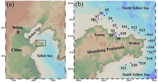 The study area is in the coastal waters of Yantai and Weihai on the Shandong Peninsula (36.6–38.2° N, 120.6–122.8° E), adjacent to the south of North Yellow Sea and the north of South Yellow Sea (Figure 1a,b). The water depth in this marine area ranges from 10 to 30 m. This area is, in fact, influenced by the combined currents of the Bohai Sea and Yellow Sea, resulting in pronounced seasonal tidal variations []. The Shandong Peninsula are characterized by excellent coastal water quality, with abundant nutrients, making them suitable for the growth of diverse marine organisms. Furthermore, these coastal areas serve not only as key bases for fishing and marine farming but also as centres for aquaculture activities in North China []. However, the rapid development of fisheries and aquaculture in the region, in combination with the intensification of coastal industrialization and urbanization, has led to increasingly severe metals pollution issues []. These environmental issues are mainly derived from industrial discharges, agricultural wastes, and aquaculture effluents, degrading water quality and potentially entering marine organisms through the food chain and, consequently, compromising the safety of aquaculture production and the quality of aquatic products. The long-term accumulation of metals poses a serious threat to aquatic species diversity and ecological balance. It is, therefore, urgent to conduct in-depth studies on the distribution patterns of these pollutants and their associated risks to ensure the sustainable development of the ecological environment.