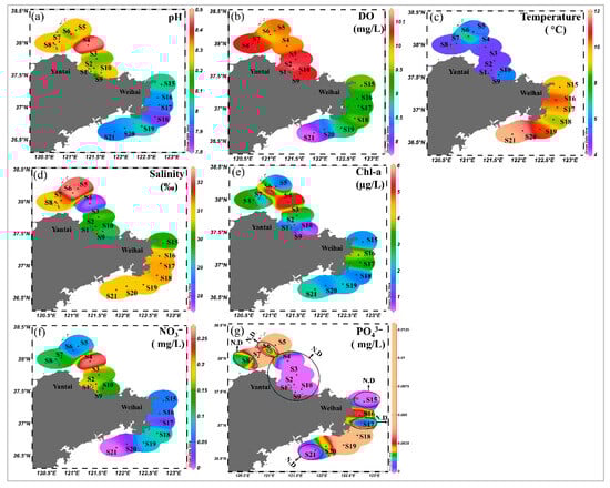 Spatial distributions of (a) pH, (b) DO, (c) temperature, (d) salinity, (e) Chl-a, (f) NO3−, and (g) PO43− in the Shandong Peninsula, China.
