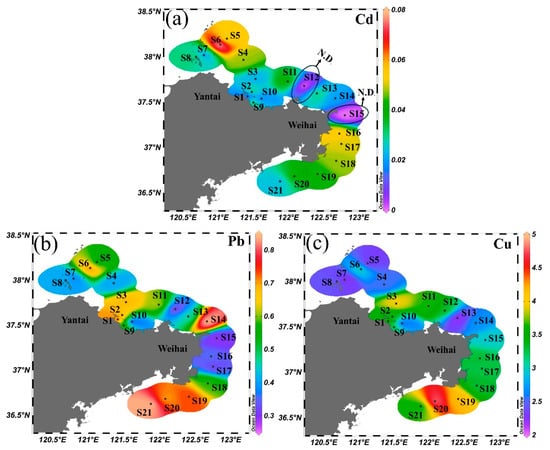 As shown in Figure 3a, the Cd concentrations were below the analytical detection limit at the S12 and S15 (the detection point area circled in the figure was not detected). On the other hand, the highest Cd concentration was 0.079 µg L−1 at the S6 sampling station, with an average value of 0.033 µg L−1. Two distinct near-shore enrichment zones were found, namely Sishili Bay (S5–S6) and the southern Weihai sector (S16–S20). Both areas were characterized by the presence of densely distributed industrial facilities, small river outlets, and ship-repair yards, which might result in the discharge of Cd-bearing wastewaters []. In contrast, the central coastal region encompassing stations S8 to S13 (Transverse section of S8 connected to S13 in Figure 3a) exhibited comparatively lower Cd concentrations overall, suggesting a general seaward decrease influenced by the dispersive effects of the Yellow Sea Coastal Current.