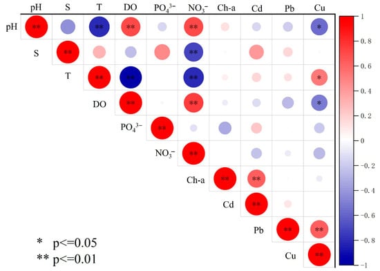 Pearson correlations between pH, DO, Chl-a, T, S, PO43−, NO3−, Cd, Pb, and Cu in the Shandong Peninsula, China.